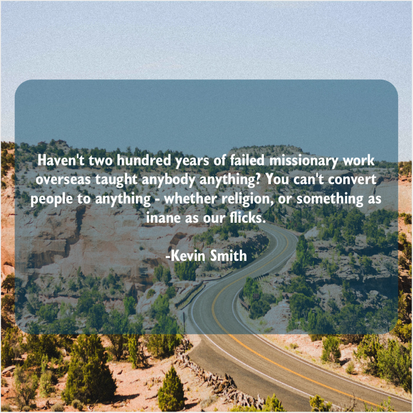 Kevin Smith Kevin Smith – Haven’t two hundred years of… August 23, 2019 admin “Haven’t two hundred years of failed missionary work overseas taught anybody anything? You can’t convert people to anything – whether religion, or something as inane as our flicks.”-Kevin Smith