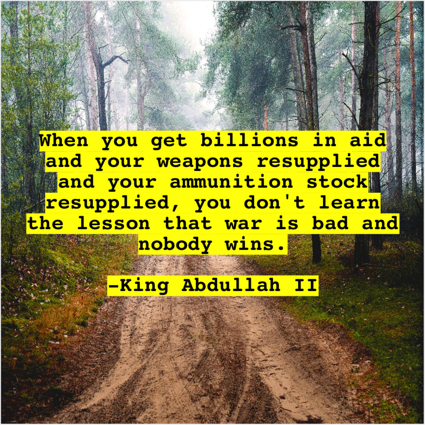 King Abdullah II King Abdullah II – When you get billions in… June 24, 2019 admin “When you get billions in aid and your weapons resupplied and your ammunition stock resupplied, you don’t learn the lesson that war is bad and nobody wins.”-King Abdullah II