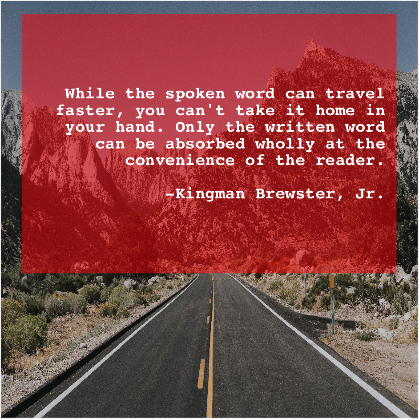 Kingman Brewster, Jr. Kingman Brewster, Jr. – While the spoken word can… April 24, 2019 admin “While the spoken word can travel faster, you can’t take it home in your hand. Only the written word can be absorbed wholly at the convenience of the reader.”-Kingman Brewster, Jr.