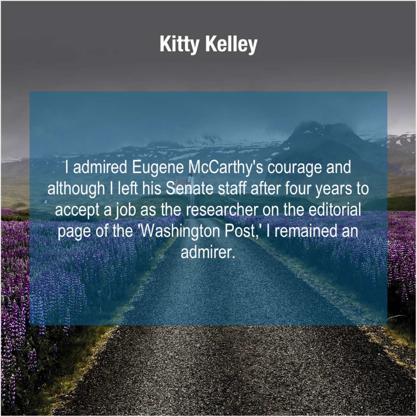Kitty Kelley Kitty Kelley – I admired Eugene McCarthy’s courage… May 18, 2019 admin “I admired Eugene McCarthy’s courage and although I left his Senate staff after four years to accept a job as the researcher on the editorial page of the ‘Washington Post,’ I remained an admirer.”-Kitty Kelley