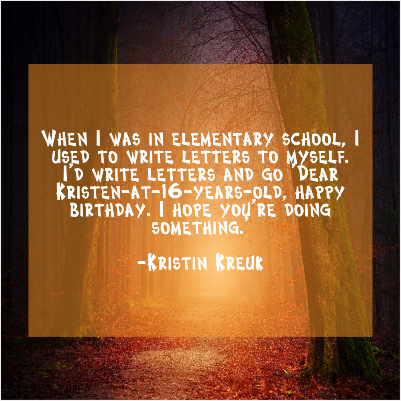 Kristin Kreuk Kristin Kreuk – When I was in elementary… February 23, 2019 admin “When I was in elementary school, I used to write letters to myself. I’d write letters and go ‘Dear Kristen-at-16-years-old, happy birthday. I hope you’re doing something.'”-Kristin Kreuk