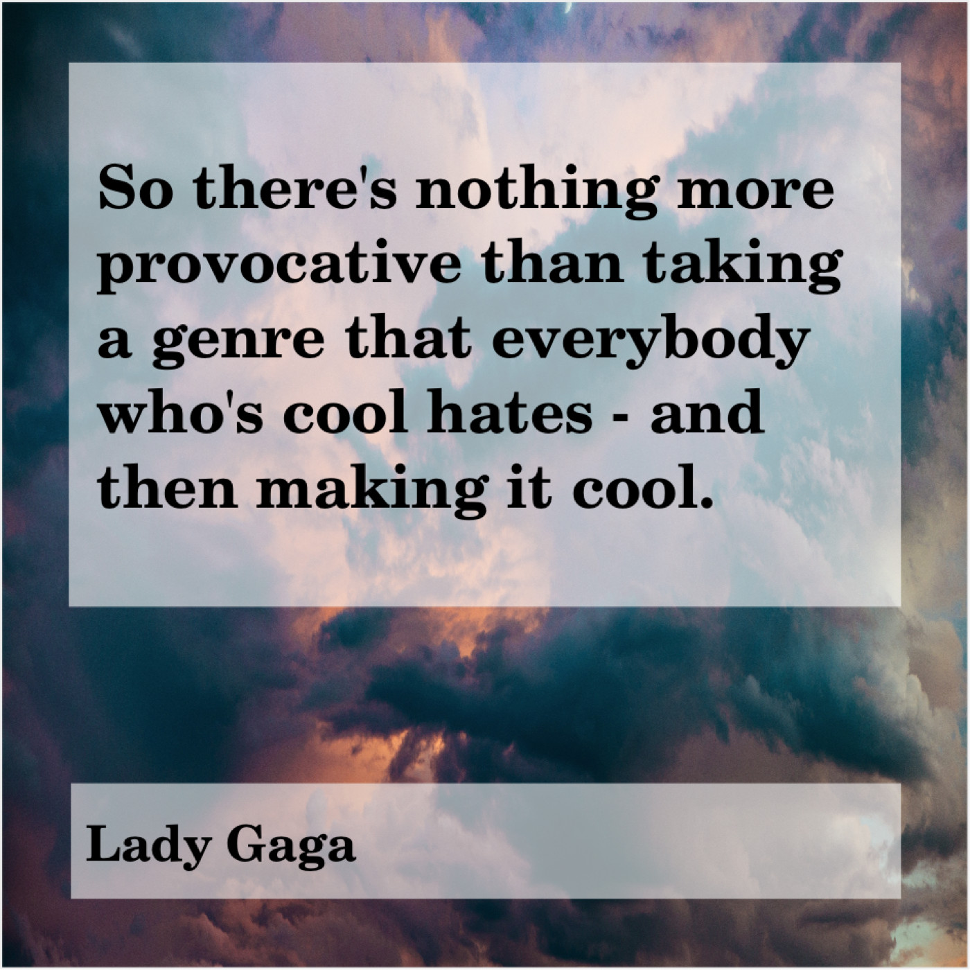 Lady Gaga Lady Gaga – So there’s nothing more provocative… March 23, 2019 admin “So there’s nothing more provocative than taking a genre that everybody who’s cool hates – and then making it cool.”-Lady Gaga