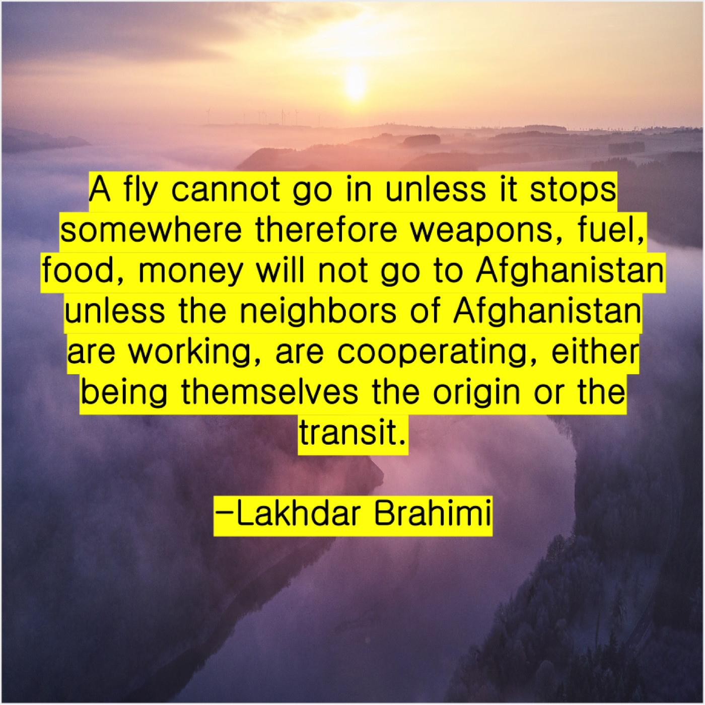 Lakhdar Brahimi Lakhdar Brahimi – A fly cannot go in… March 5, 2019 admin “A fly cannot go in unless it stops somewhere therefore weapons, fuel, food, money will not go to Afghanistan unless the neighbors of Afghanistan are working, are cooperating, either being themselves the origin or the transit.”-Lakhdar Brahimi