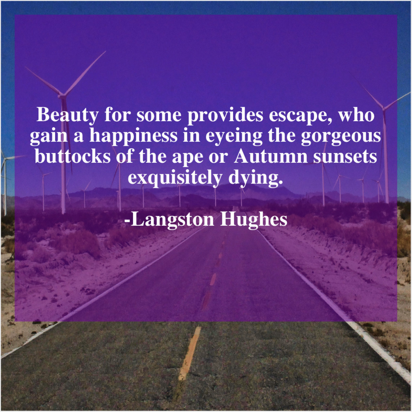 Langston Hughes Langston Hughes – Beauty for some provides escape… March 26, 2019 admin “Beauty for some provides escape, who gain a happiness in eyeing the gorgeous buttocks of the ape or Autumn sunsets exquisitely dying.”-Langston Hughes
