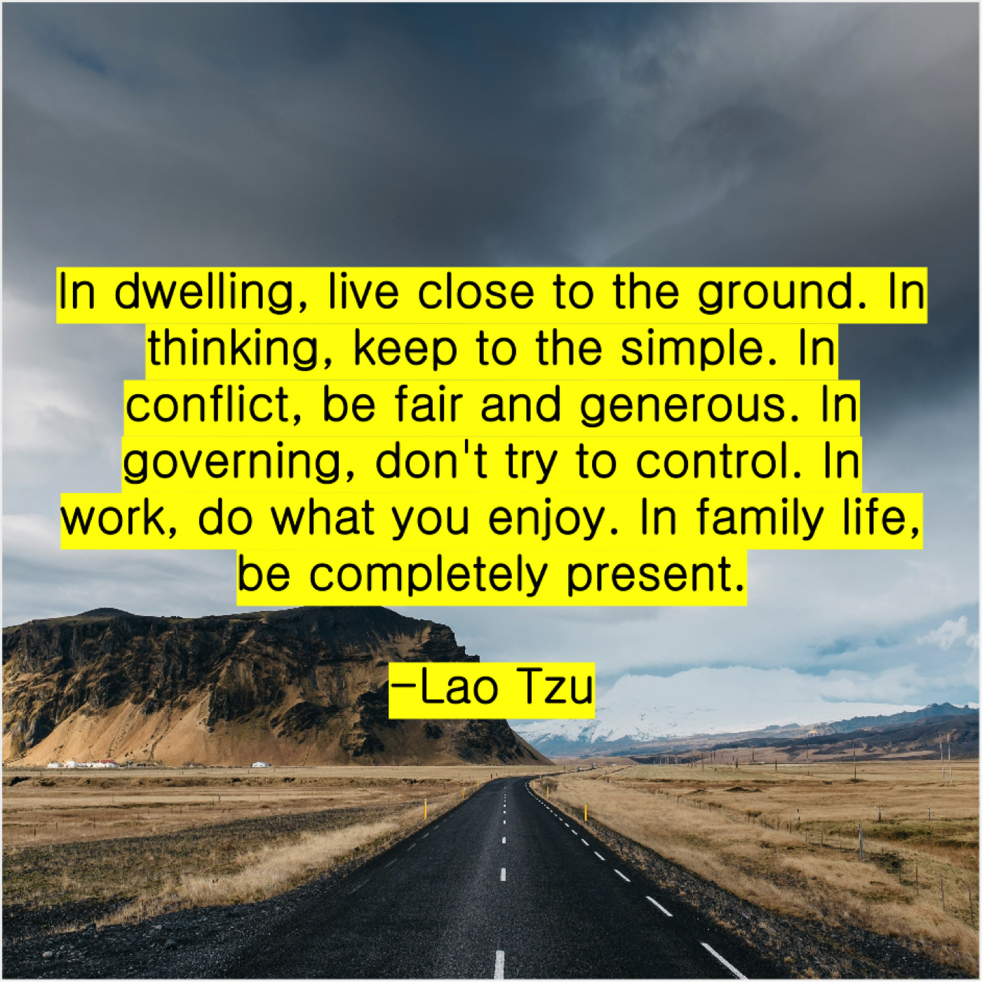 Lao Tzu Lao Tzu – In dwelling, live close to… March 1, 2019 admin “In dwelling, live close to the ground. In thinking, keep to the simple. In conflict, be fair and generous. In governing, don’t try to control. In work, do what you enjoy. In family life, be completely present.”-Lao Tzu
