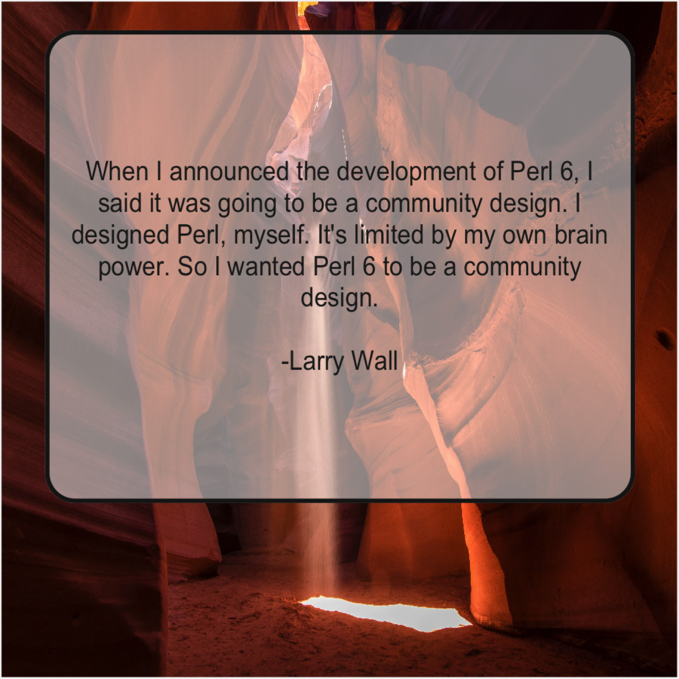Larry Wall Larry Wall – When I announced the development… May 20, 2019 admin “When I announced the development of Perl 6, I said it was going to be a community design. I designed Perl, myself. It’s limited by my own brain power. So I wanted Perl 6 to be a community design.”-Larry Wall