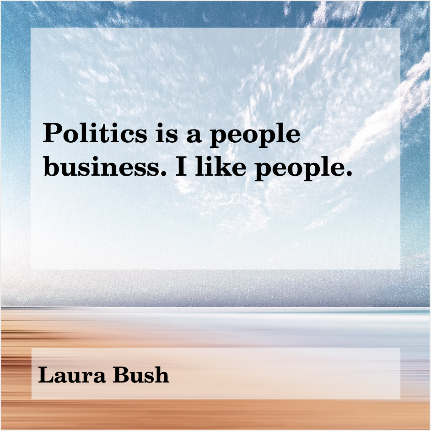 Laura Bush Laura Bush – Politics is a people business… February 13, 2019 admin “Politics is a people business. I like people.”-Laura Bush