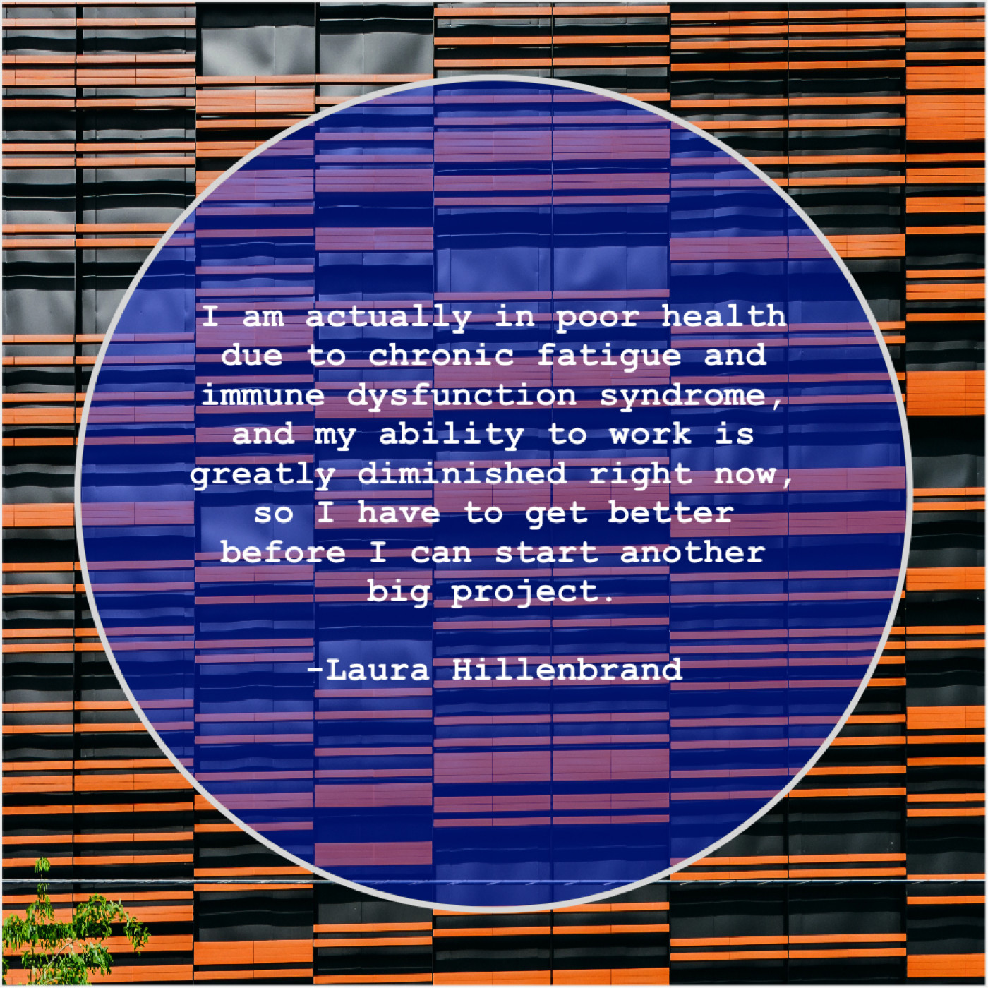 Laura Hillenbrand Laura Hillenbrand – I am actually in poor… February 22, 2019 admin “I am actually in poor health due to chronic fatigue and immune dysfunction syndrome, and my ability to work is greatly diminished right now, so I have to get better before I can start another big project.”-Laura Hillenbrand
