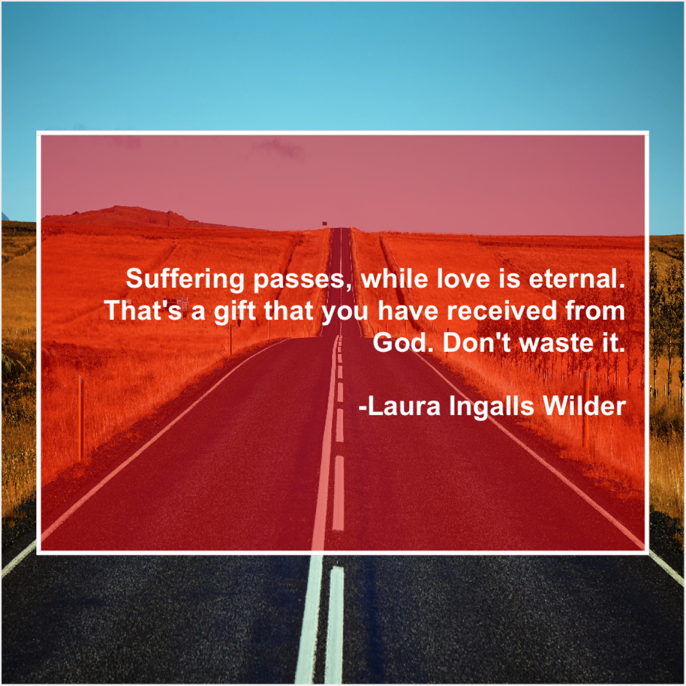 Laura Ingalls Wilder Laura Ingalls Wilder – Suffering passes, while love is… June 27, 2019 admin “Suffering passes, while love is eternal. That’s a gift that you have received from God. Don’t waste it.”-Laura Ingalls Wilder