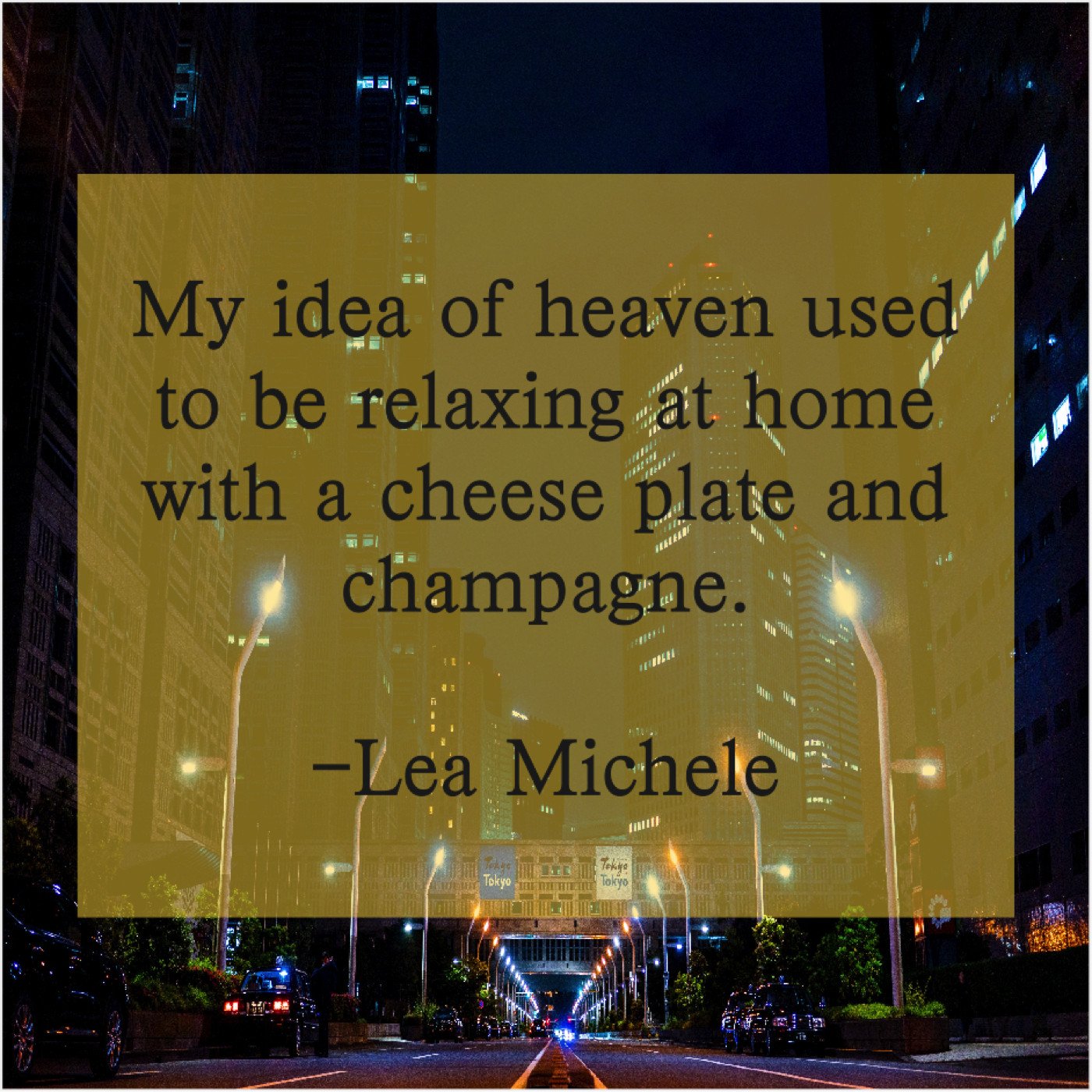 Lea Michele Lea Michele – My idea of heaven used… December 27, 2018 admin “My idea of heaven used to be relaxing at home with a cheese plate and champagne.”-Lea Michele