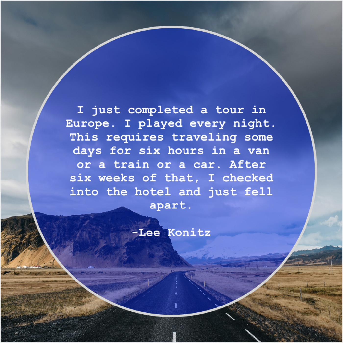 Lee Konitz Lee Konitz – I just completed a tour… February 26, 2019 admin “I just completed a tour in Europe. I played every night. This requires traveling some days for six hours in a van or a train or a car. After six weeks of that, I checked into the hotel and just fell apart.”-Lee Konitz