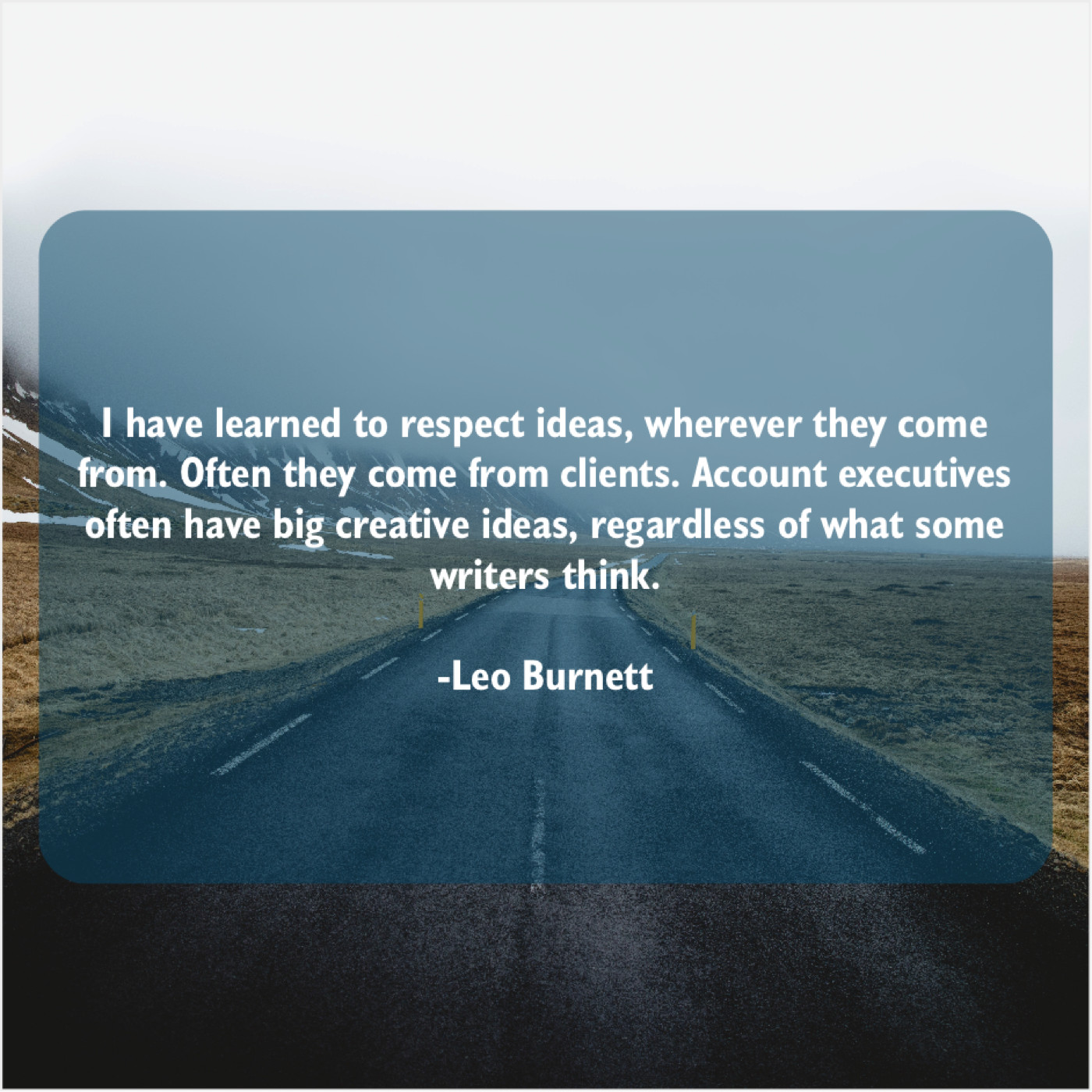 Leo Burnett Leo Burnett – I have learned to respect… March 12, 2019 admin “I have learned to respect ideas, wherever they come from. Often they come from clients. Account executives often have big creative ideas, regardless of what some writers think.”-Leo Burnett