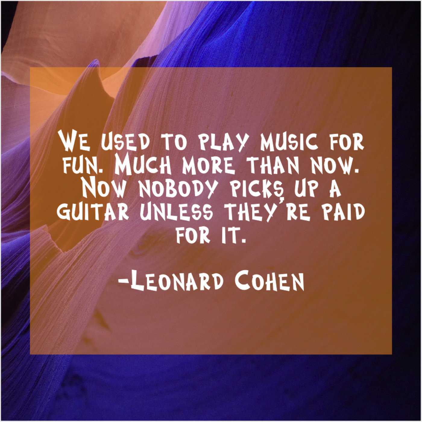 Leonard Cohen Leonard Cohen – We used to play music… October 31, 2018 admin “We used to play music for fun. Much more than now. Now nobody picks up a guitar unless they’re paid for it.”-Leonard Cohen