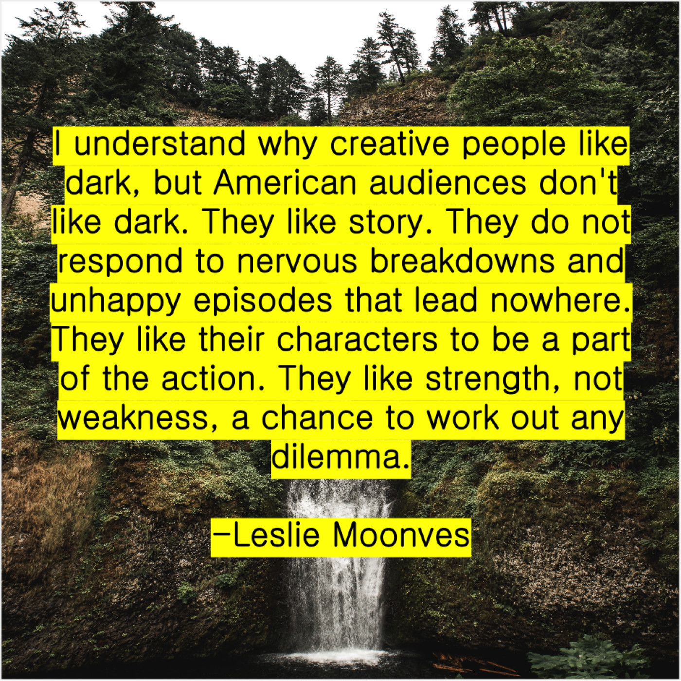 “I understand why creative people like dark, but American audiences don’t like dark. They like story. They do not respond to nervous breakdowns and unhappy episodes that lead nowhere. They like their characters to be a part of the action. They like strength, not weakness, a chance to work out any dilemma.”