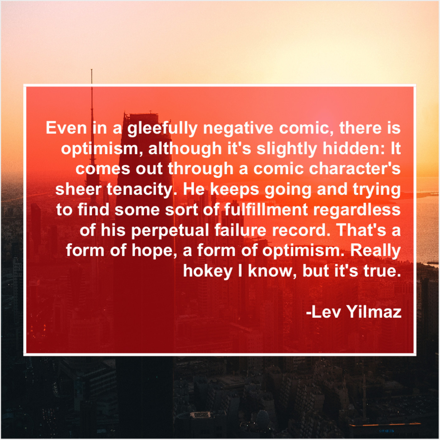 “Even in a gleefully negative comic, there is optimism, although it’s slightly hidden: It comes out through a comic character’s sheer tenacity. He keeps going and trying to find some sort of fulfillment regardless of his perpetual failure record. That’s a form of hope, a form of optimism. Really hokey I know, but it’s true.”