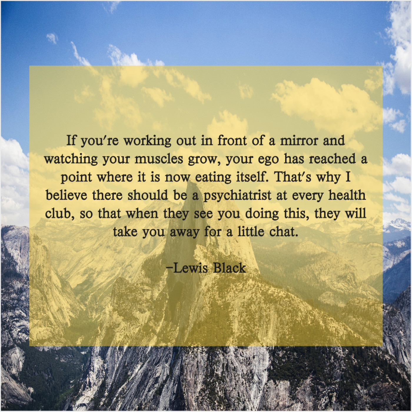 “If you’re working out in front of a mirror and watching your muscles grow, your ego has reached a point where it is now eating itself. That’s why I believe there should be a psychiatrist at every health club, so that when they see you doing this, they will take you away for a little chat.”