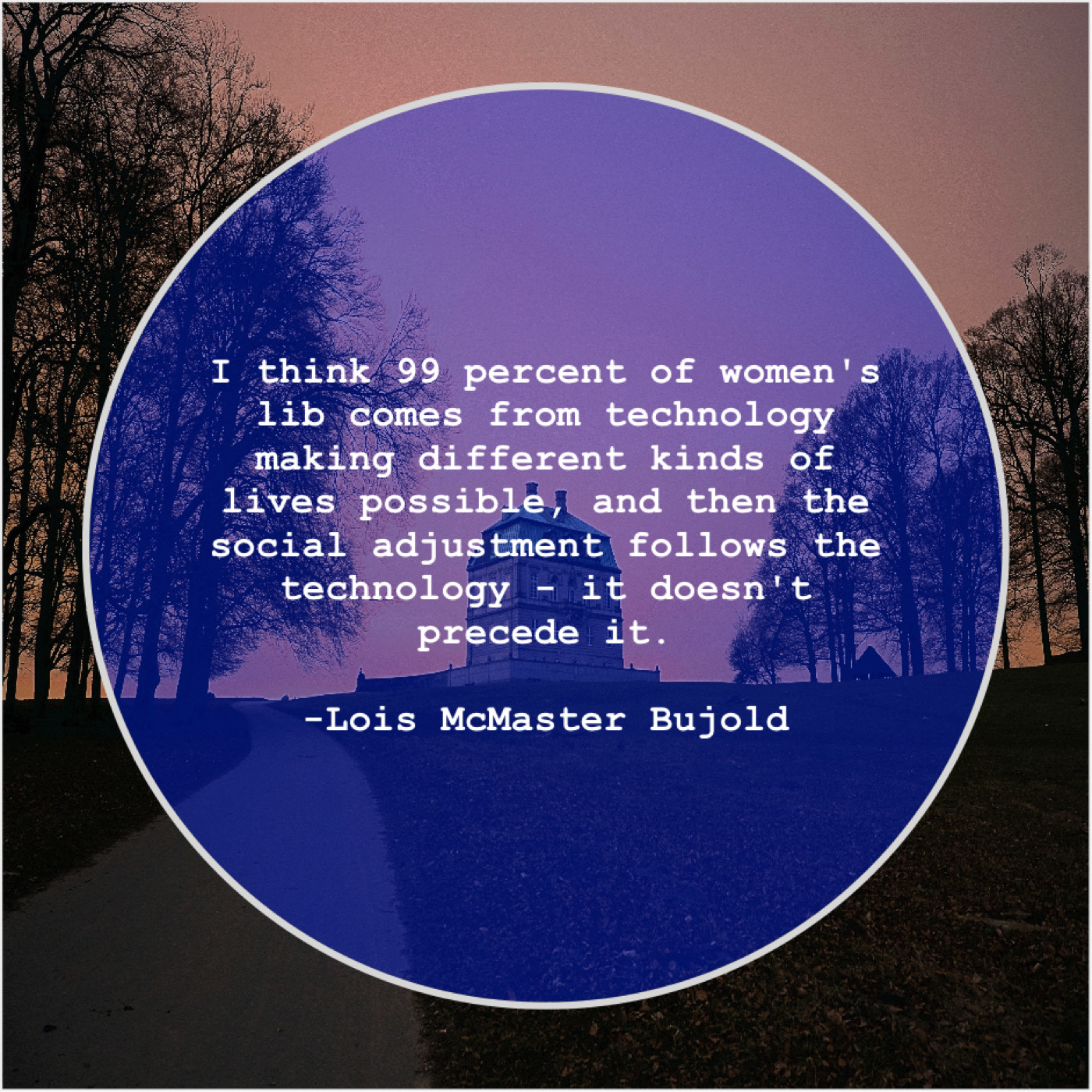 Lois McMaster Bujold Lois McMaster Bujold – I think 99 percent of… September 18, 2019 admin “I think 99 percent of women’s lib comes from technology making different kinds of lives possible, and then the social adjustment follows the technology – it doesn’t precede it.”-Lois McMaster Bujold