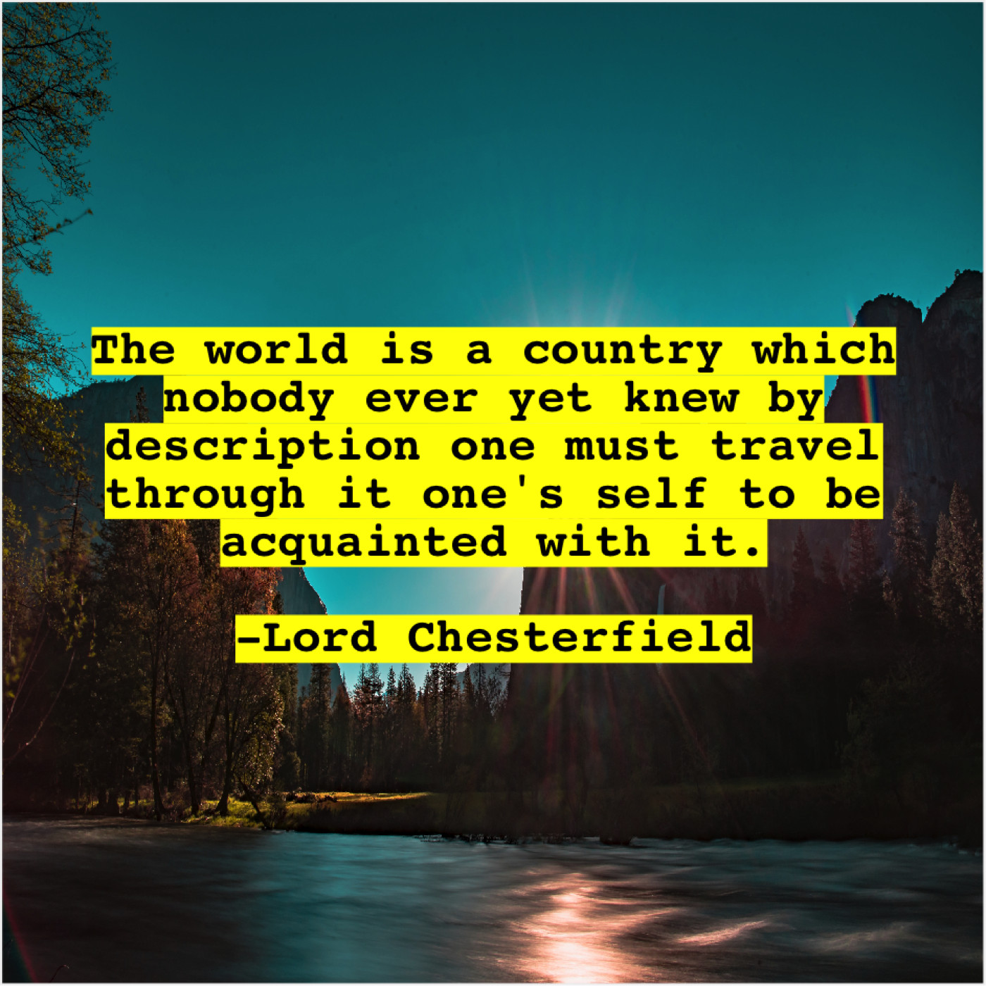 Lord Chesterfield Lord Chesterfield – The world is a country… July 3, 2019 admin “The world is a country which nobody ever yet knew by description one must travel through it one’s self to be acquainted with it.”-Lord Chesterfield