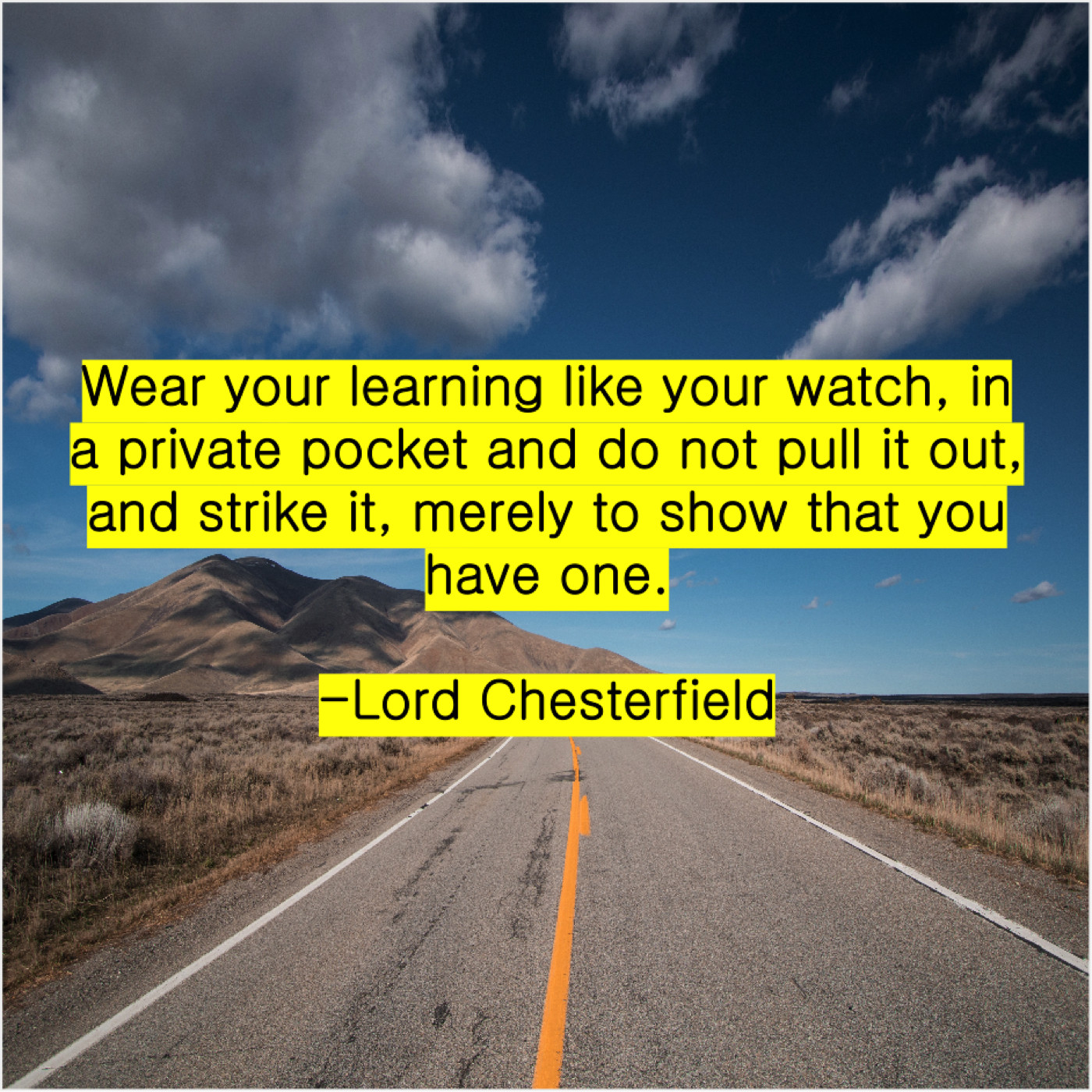 Lord Chesterfield Lord Chesterfield – Wear your learning like your… August 23, 2019 admin “Wear your learning like your watch, in a private pocket and do not pull it out, and strike it, merely to show that you have one.”-Lord Chesterfield