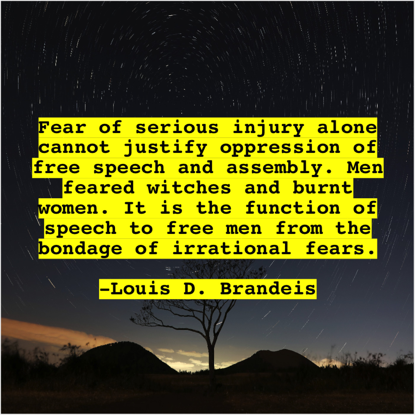 Louis D. Brandeis Louis D. Brandeis – Fear of serious injury alone… July 30, 2019 admin “Fear of serious injury alone cannot justify oppression of free speech and assembly. Men feared witches and burnt women. It is the function of speech to free men from the bondage of irrational fears.”-Louis D. Brandeis