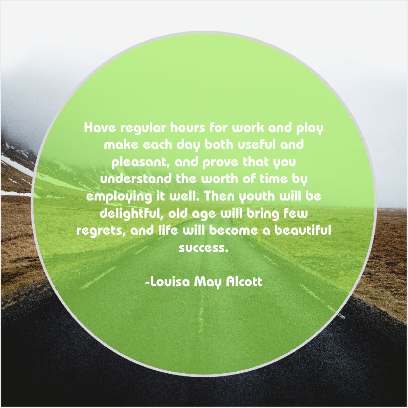 “Have regular hours for work and play make each day both useful and pleasant, and prove that you understand the worth of time by employing it well. Then youth will be delightful, old age will bring few regrets, and life will become a beautiful success.”