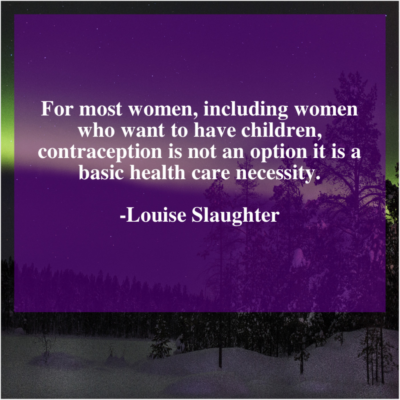 Louise Slaughter Louise Slaughter – For most women, including women… December 21, 2018 admin “For most women, including women who want to have children, contraception is not an option it is a basic health care necessity.”-Louise Slaughter