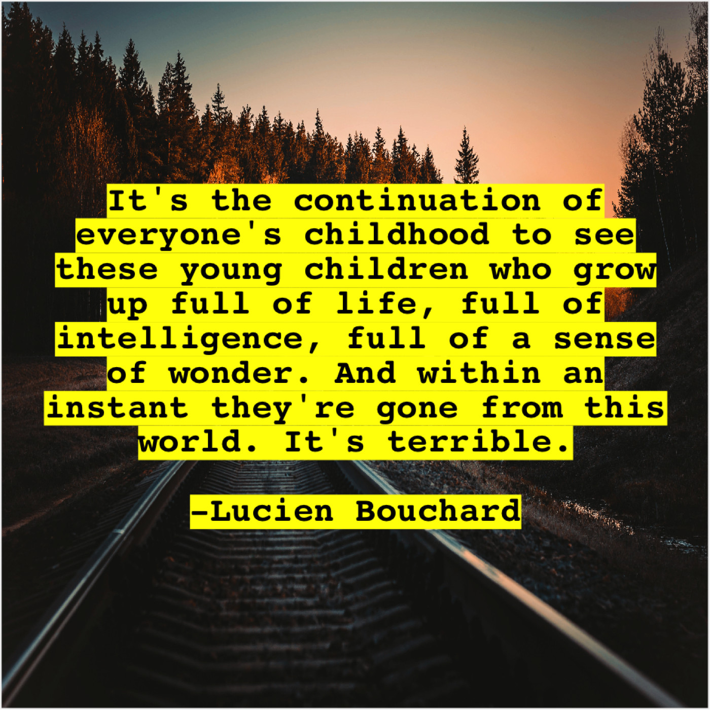 Lucien Bouchard Lucien Bouchard – It’s the continuation of everyone’s… April 27, 2019 admin “It’s the continuation of everyone’s childhood to see these young children who grow up full of life, full of intelligence, full of a sense of wonder. And within an instant they’re gone from this world. It’s terrible.”-Lucien Bouchard
