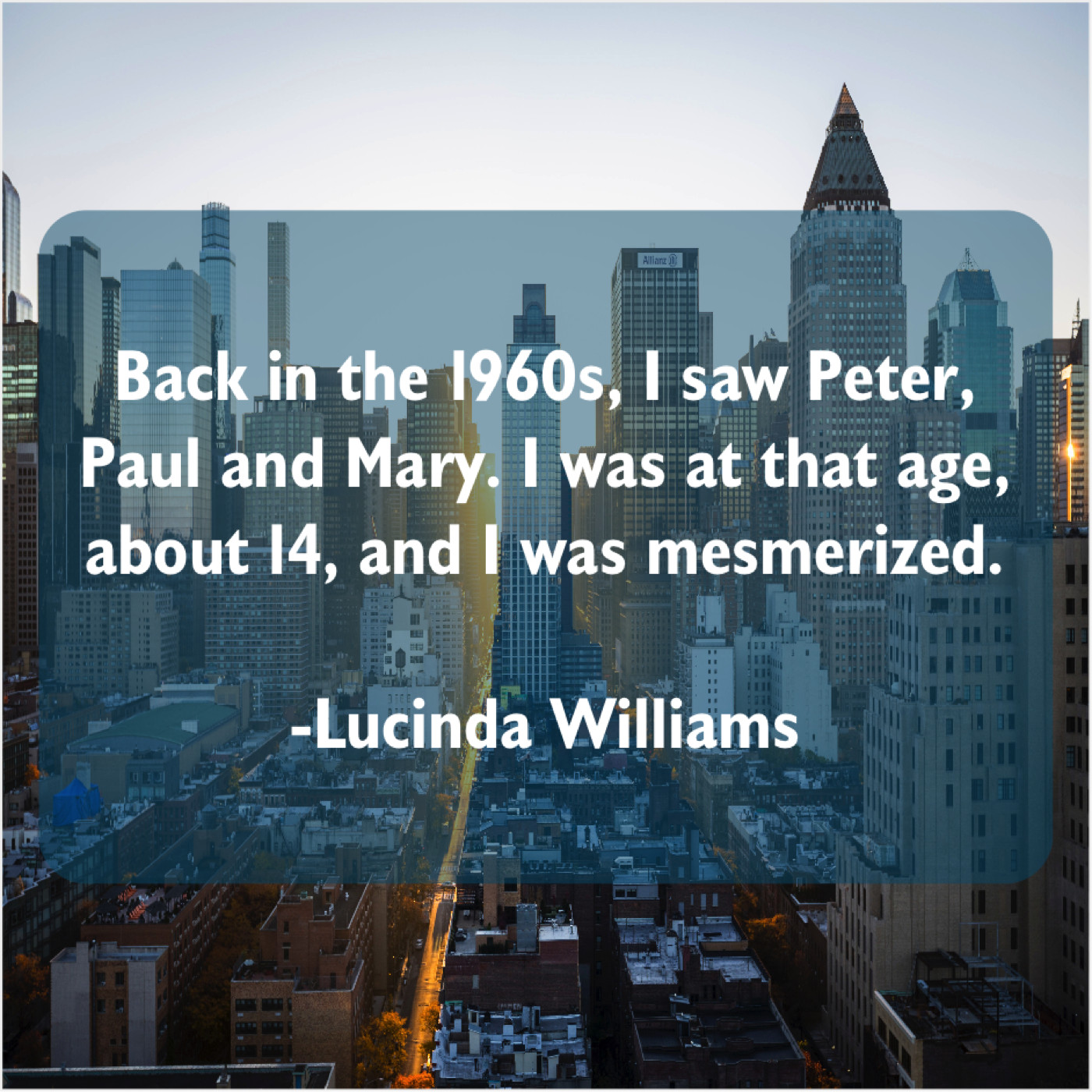 Lucinda Williams Lucinda Williams – Back in the 1960s, I… July 15, 2019 admin “Back in the 1960s, I saw Peter, Paul and Mary. I was at that age, about 14, and I was mesmerized.”-Lucinda Williams
