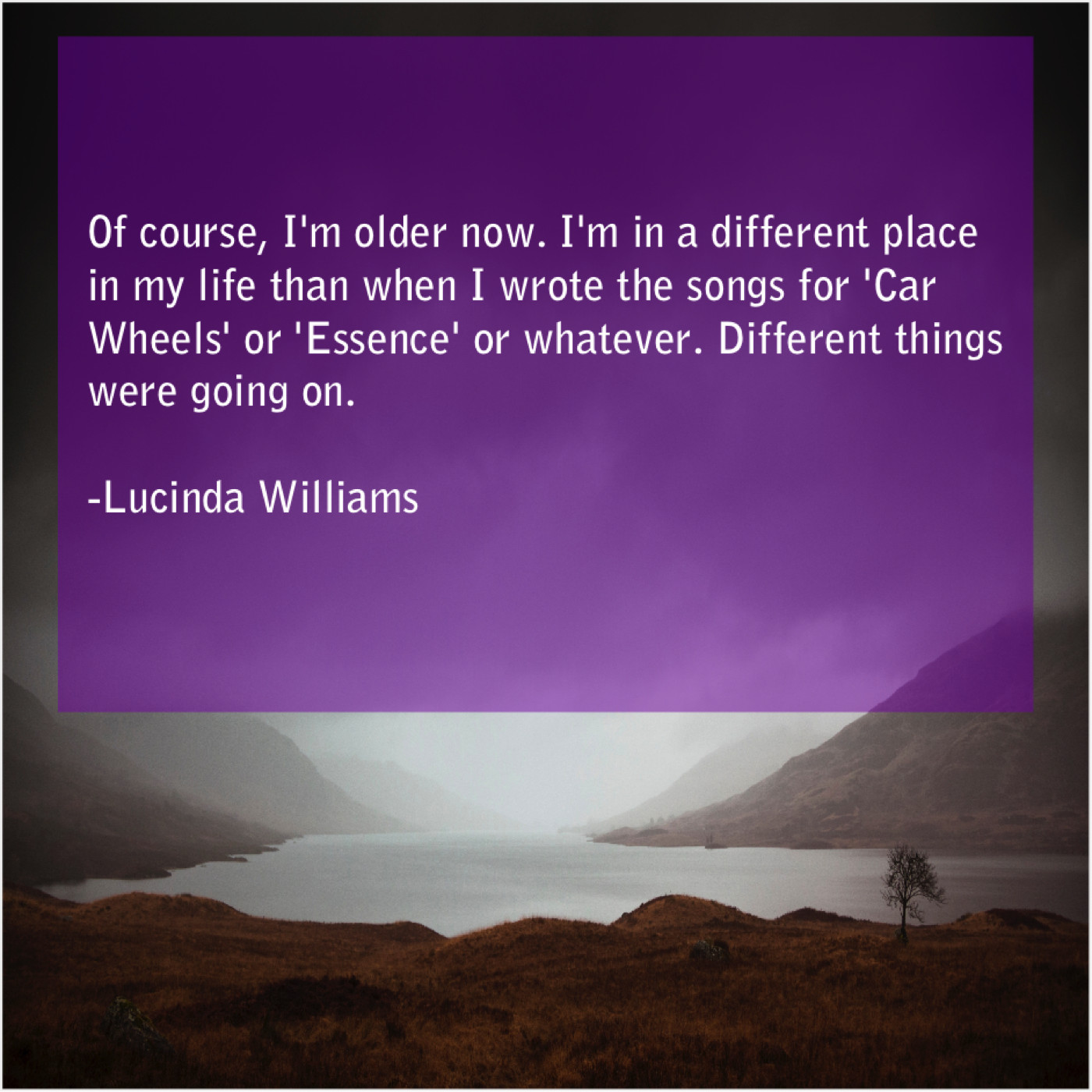 Lucinda Williams Lucinda Williams – Of course, I’m older now… February 17, 2019 admin “Of course, I’m older now. I’m in a different place in my life than when I wrote the songs for ‘Car Wheels’ or ‘Essence’ or whatever. Different things were going on.”-Lucinda Williams