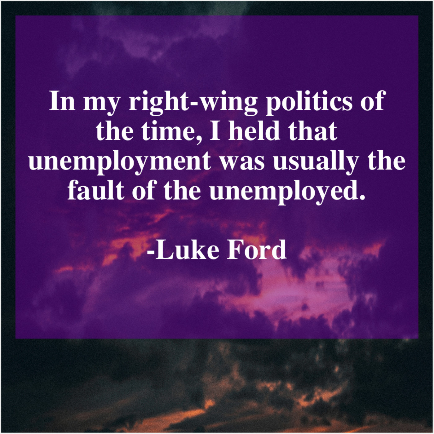 Luke Ford Luke Ford – In my right-wing politics… March 1, 2019 admin “In my right-wing politics of the time, I held that unemployment was usually the fault of the unemployed.”-Luke Ford