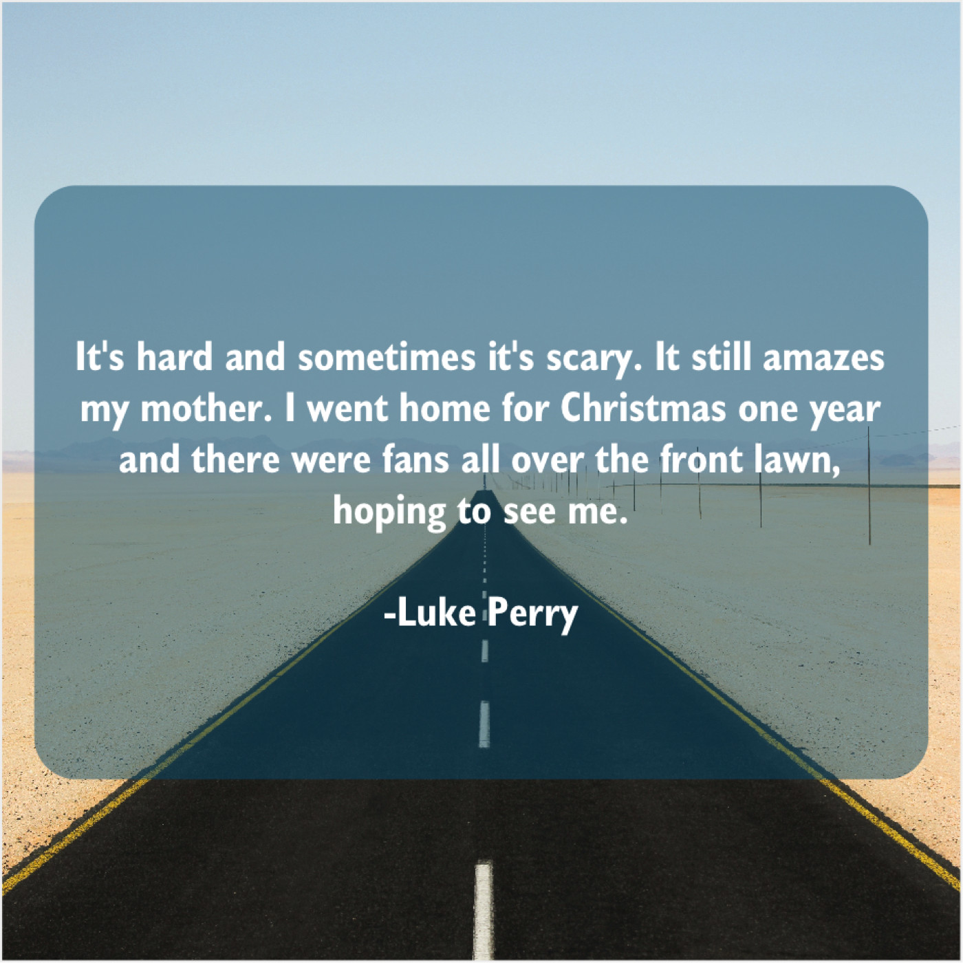 Luke Perry Luke Perry – It’s hard and sometimes it’s… August 15, 2019 admin “It’s hard and sometimes it’s scary. It still amazes my mother. I went home for Christmas one year and there were fans all over the front lawn, hoping to see me.”-Luke Perry