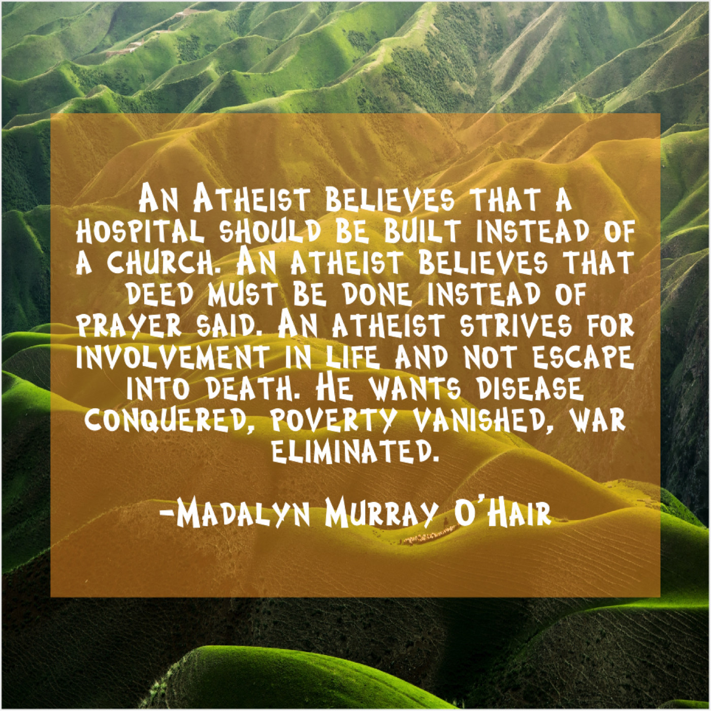 “An Atheist believes that a hospital should be built instead of a church. An atheist believes that deed must be done instead of prayer said. An atheist strives for involvement in life and not escape into death. He wants disease conquered, poverty vanished, war eliminated.”