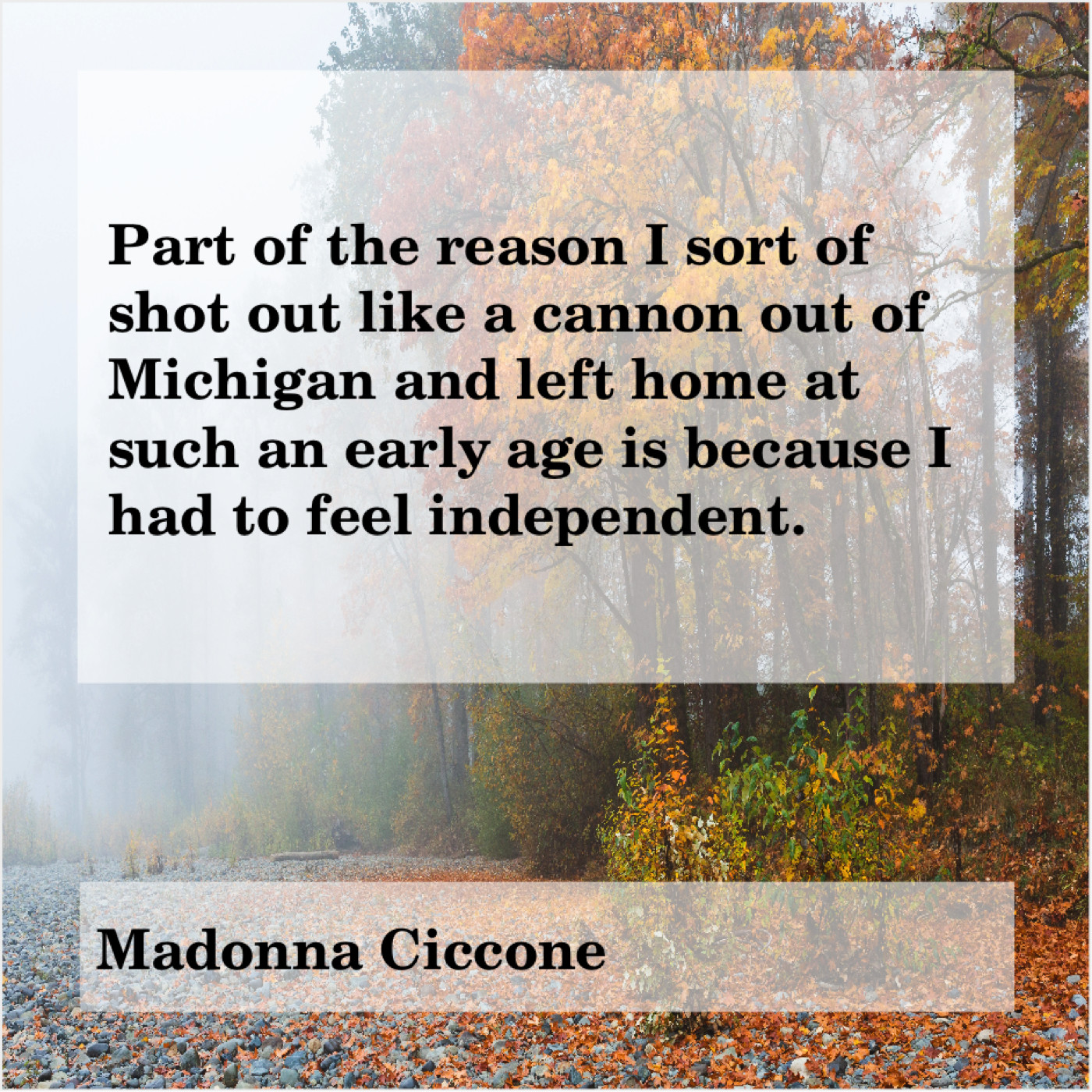 Madonna Ciccone Madonna Ciccone – Part of the reason I… December 4, 2018 admin “Part of the reason I sort of shot out like a cannon out of Michigan and left home at such an early age is because I had to feel independent.”-Madonna Ciccone