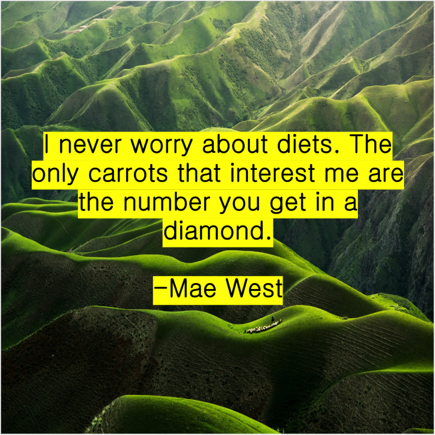 Mae West Mae West – I never worry about diets… June 22, 2019 admin “I never worry about diets. The only carrots that interest me are the number you get in a diamond.”-Mae West