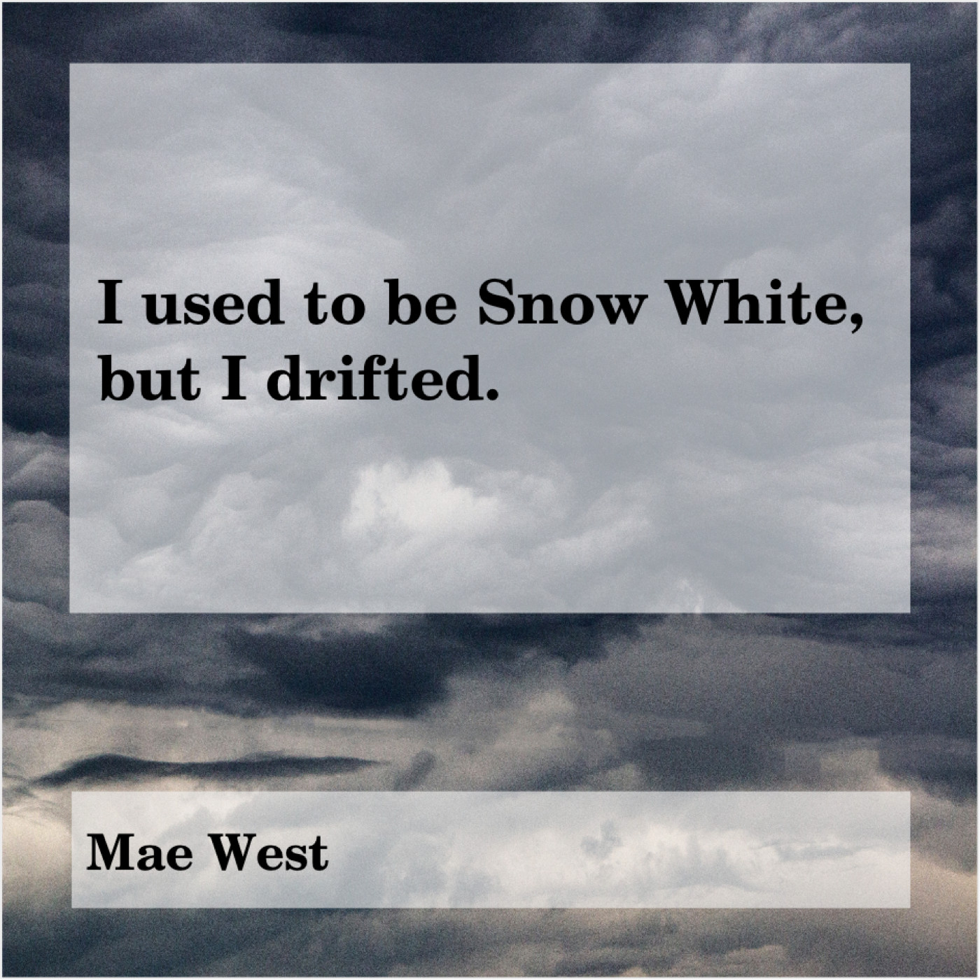 Mae West Mae West – I used to be Snow… September 6, 2019 admin “I used to be Snow White, but I drifted.”-Mae West