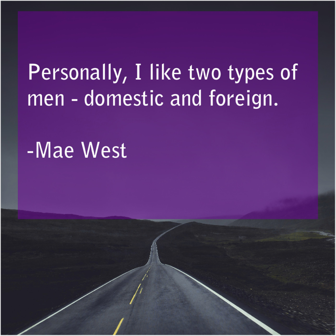 Mae West Mae West – Personally, I like two types… February 16, 2019 admin “Personally, I like two types of men – domestic and foreign.”-Mae West