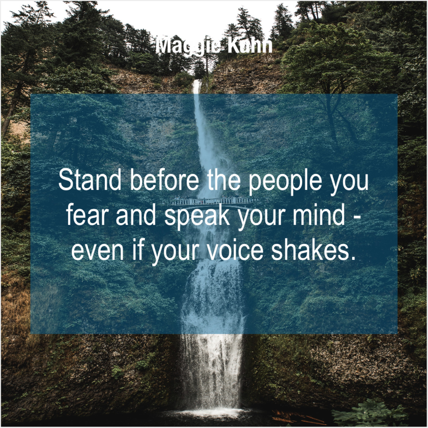 Maggie Kuhn Maggie Kuhn – Stand before the people you… February 1, 2019 admin “Stand before the people you fear and speak your mind – even if your voice shakes.”-Maggie Kuhn