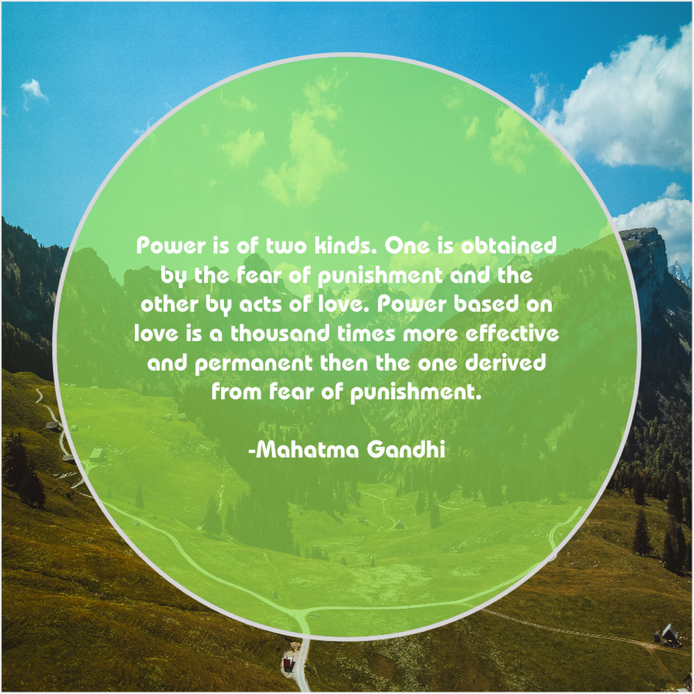 Mahatma Gandhi Mahatma Gandhi – Power is of two kinds… January 30, 2019 admin “Power is of two kinds. One is obtained by the fear of punishment and the other by acts of love. Power based on love is a thousand times more effective and permanent then the one derived from fear of punishment.”-Mahatma Gandhi