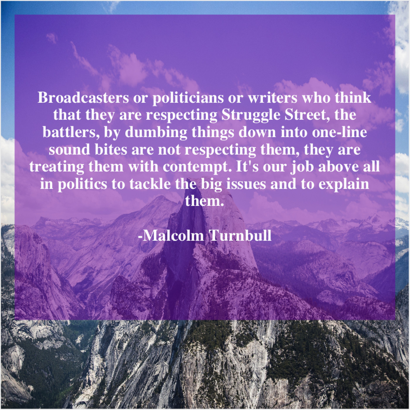 “Broadcasters or politicians or writers who think that they are respecting Struggle Street, the battlers, by dumbing things down into one-line sound bites are not respecting them, they are treating them with contempt. It’s our job above all in politics to tackle the big issues and to explain them.”