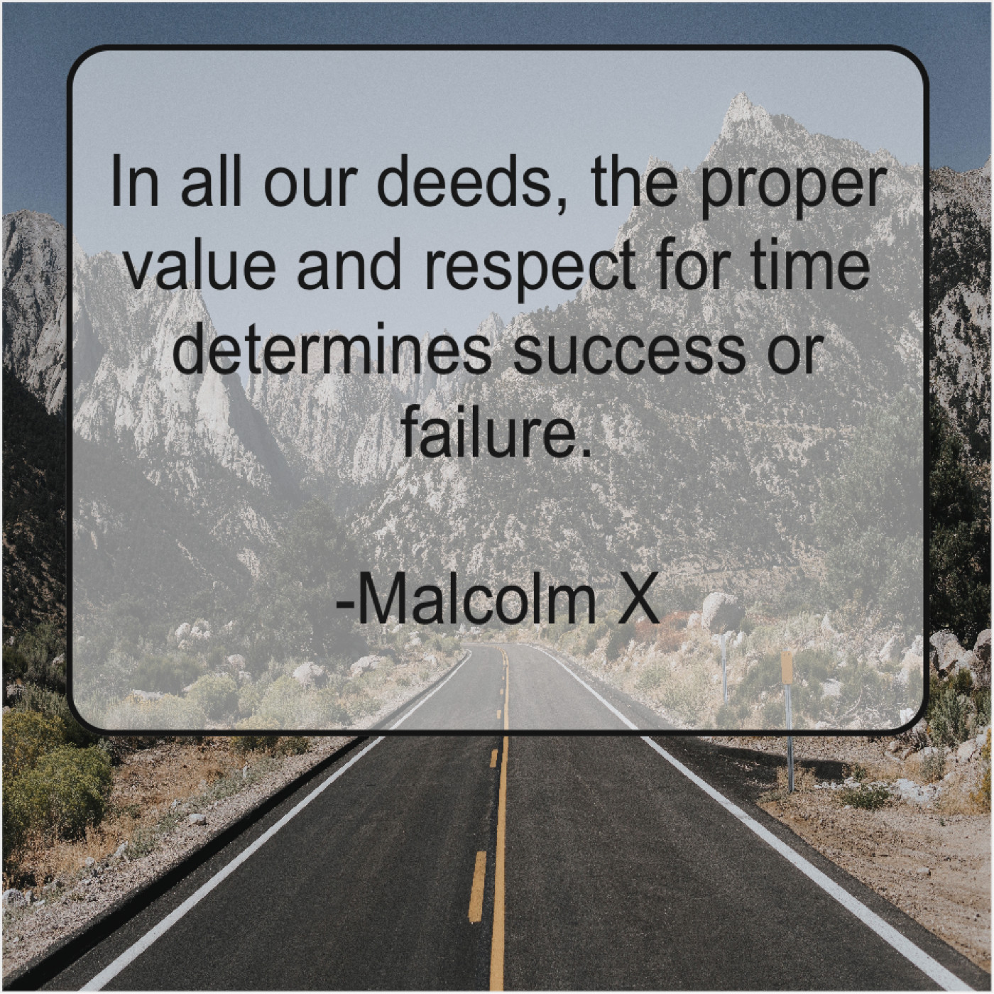 Malcolm X Malcolm X – In all our deeds, the… March 19, 2019 admin “In all our deeds, the proper value and respect for time determines success or failure.”-Malcolm X