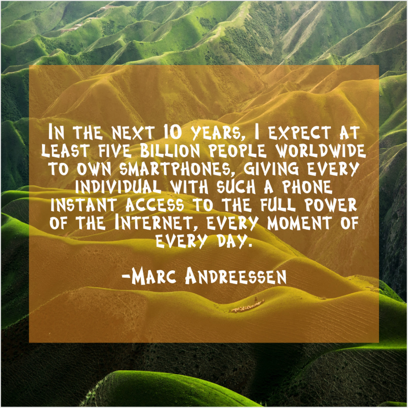 Marc Andreessen Marc Andreessen – In the next 10 years… October 4, 2019 admin “In the next 10 years, I expect at least five billion people worldwide to own smartphones, giving every individual with such a phone instant access to the full power of the Internet, every moment of every day.”-Marc Andreessen