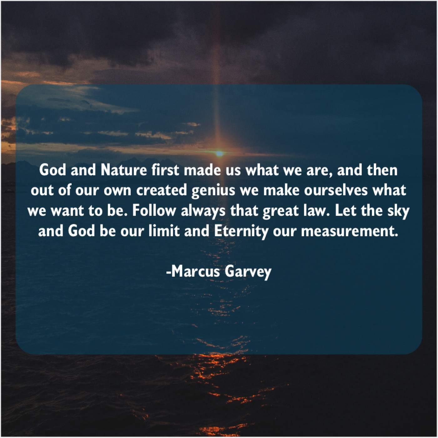 Marcus Garvey Marcus Garvey – God and Nature first made… April 18, 2019 admin “God and Nature first made us what we are, and then out of our own created genius we make ourselves what we want to be. Follow always that great law. Let the sky and God be our limit and Eternity our measurement.”-Marcus Garvey