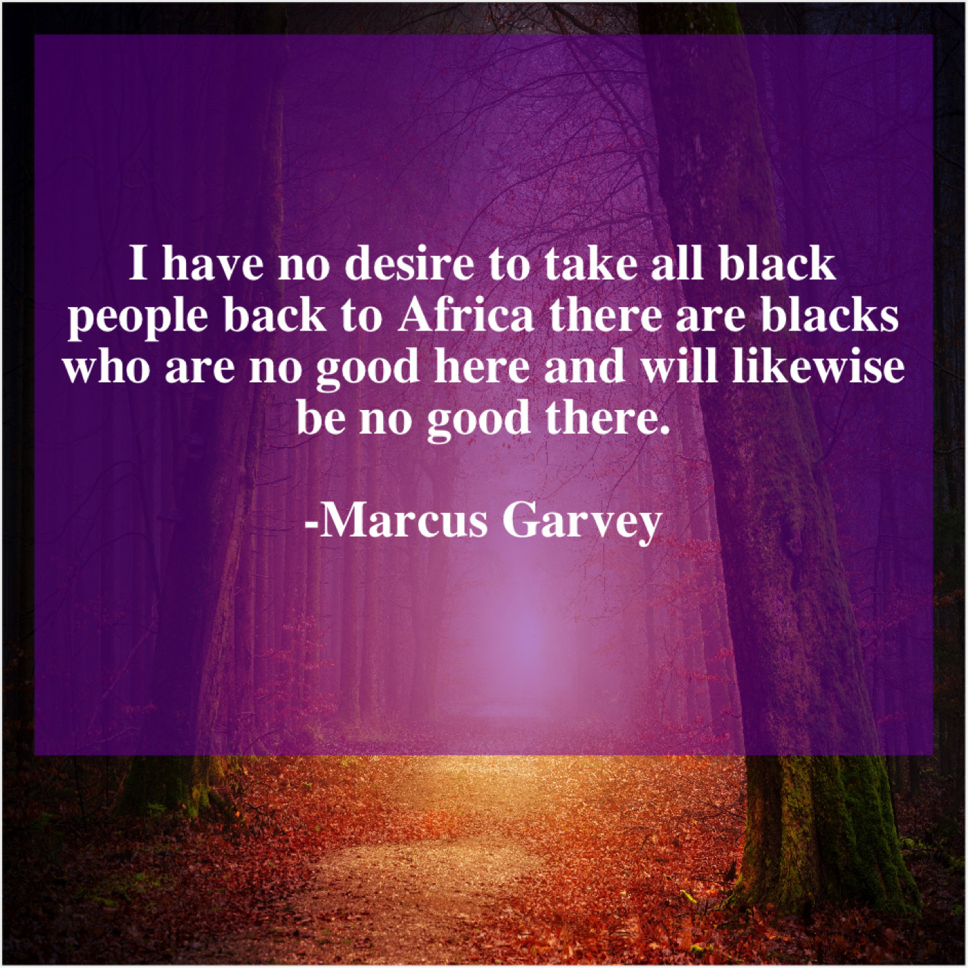 Marcus Garvey Marcus Garvey – I have no desire to… September 6, 2019 admin “I have no desire to take all black people back to Africa there are blacks who are no good here and will likewise be no good there.”-Marcus Garvey