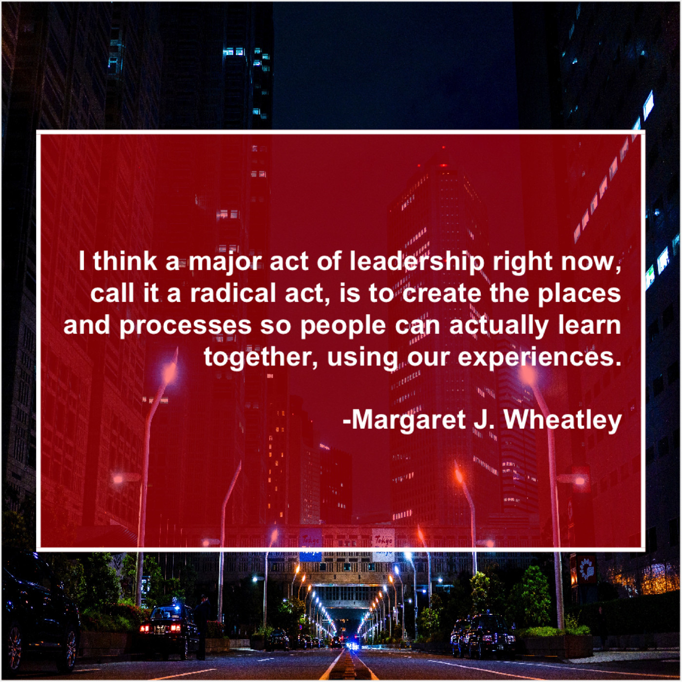 Margaret J. Wheatley Margaret J. Wheatley – I think a major act… June 20, 2019 admin “I think a major act of leadership right now, call it a radical act, is to create the places and processes so people can actually learn together, using our experiences.”-Margaret J. Wheatley