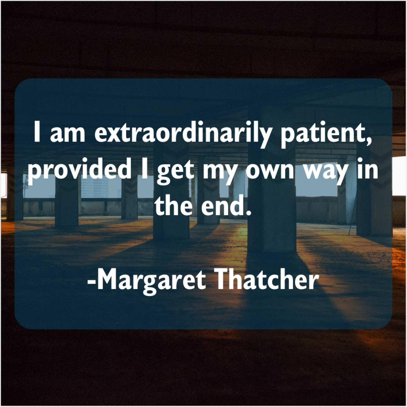 Margaret Thatcher Margaret Thatcher – I am extraordinarily patient, provided… September 9, 2019 admin “I am extraordinarily patient, provided I get my own way in the end.”-Margaret Thatcher