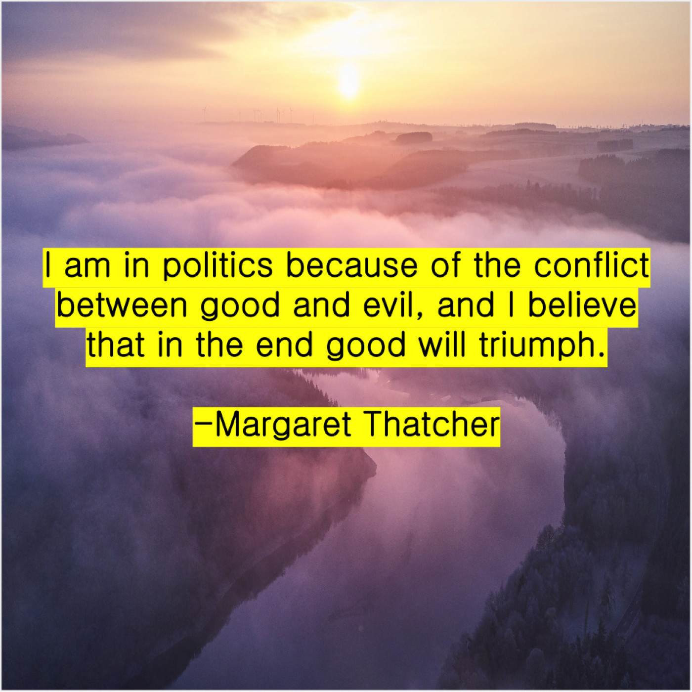 Margaret Thatcher Margaret Thatcher – I am in politics because… May 19, 2019 admin “I am in politics because of the conflict between good and evil, and I believe that in the end good will triumph.”-Margaret Thatcher