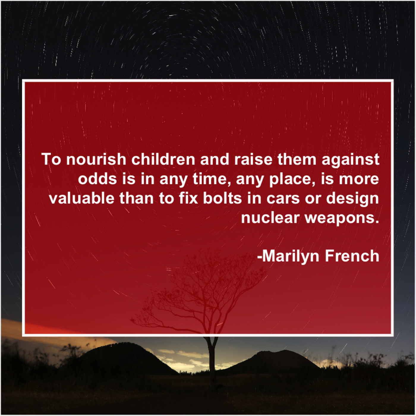 Marilyn French Marilyn French – To nourish children and raise… April 15, 2019 admin “To nourish children and raise them against odds is in any time, any place, is more valuable than to fix bolts in cars or design nuclear weapons.”-Marilyn French