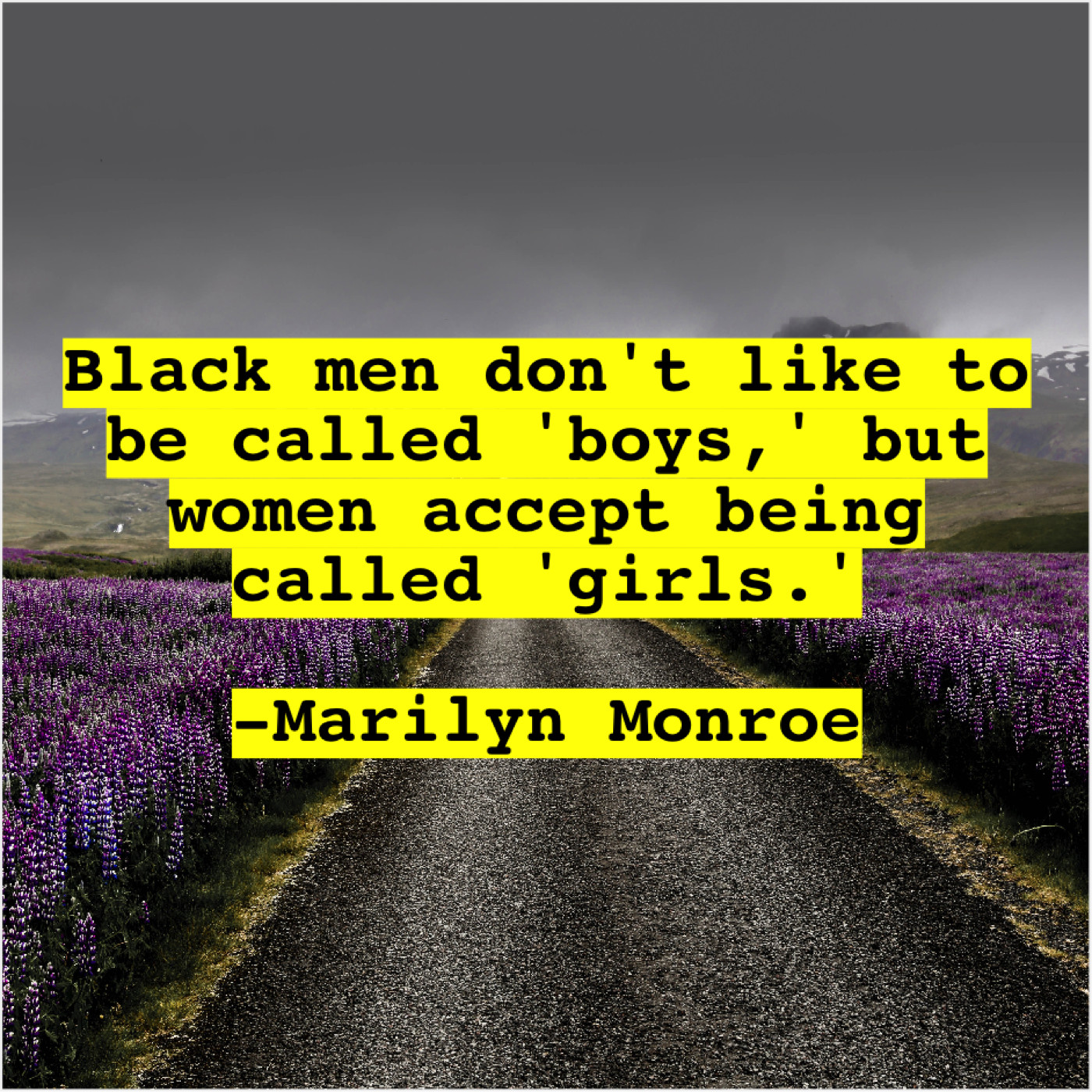 Marilyn Monroe Marilyn Monroe – Black men don’t like to… October 1, 2019 admin “Black men don’t like to be called ‘boys,’ but women accept being called ‘girls.'”-Marilyn Monroe