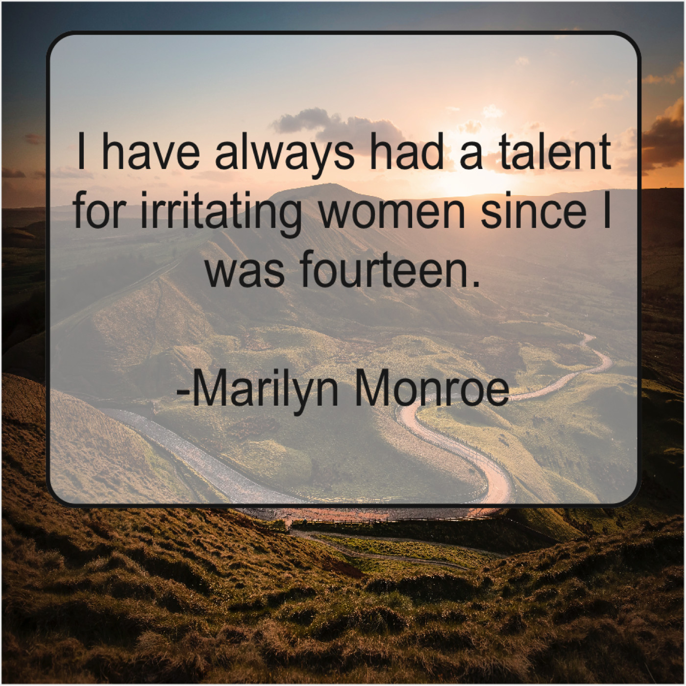 Marilyn Monroe Marilyn Monroe – I have always had a… May 10, 2019 admin “I have always had a talent for irritating women since I was fourteen.”-Marilyn Monroe