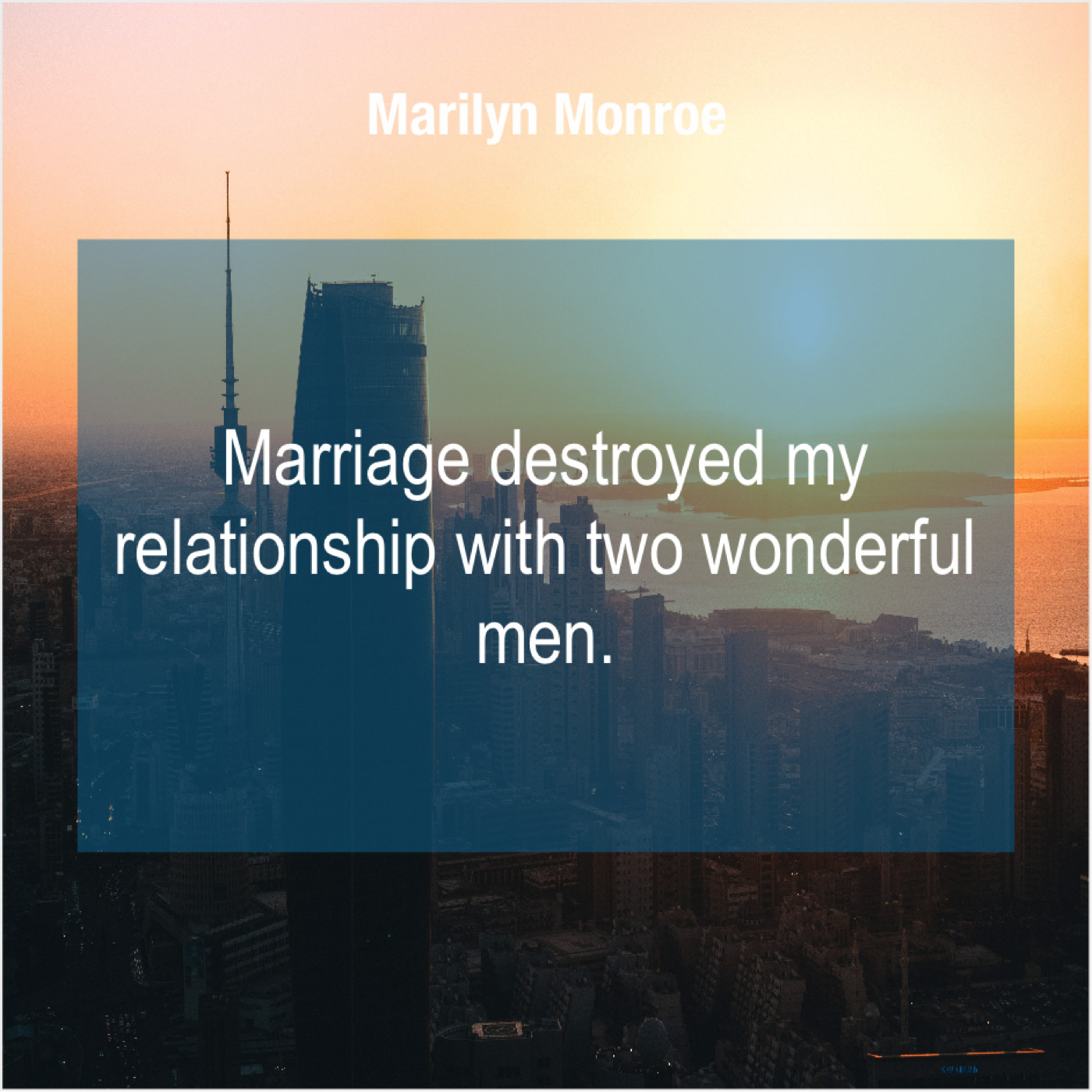 Marilyn Monroe Marilyn Monroe – Marriage destroyed my relationship with… August 1, 2019 admin “Marriage destroyed my relationship with two wonderful men.”-Marilyn Monroe